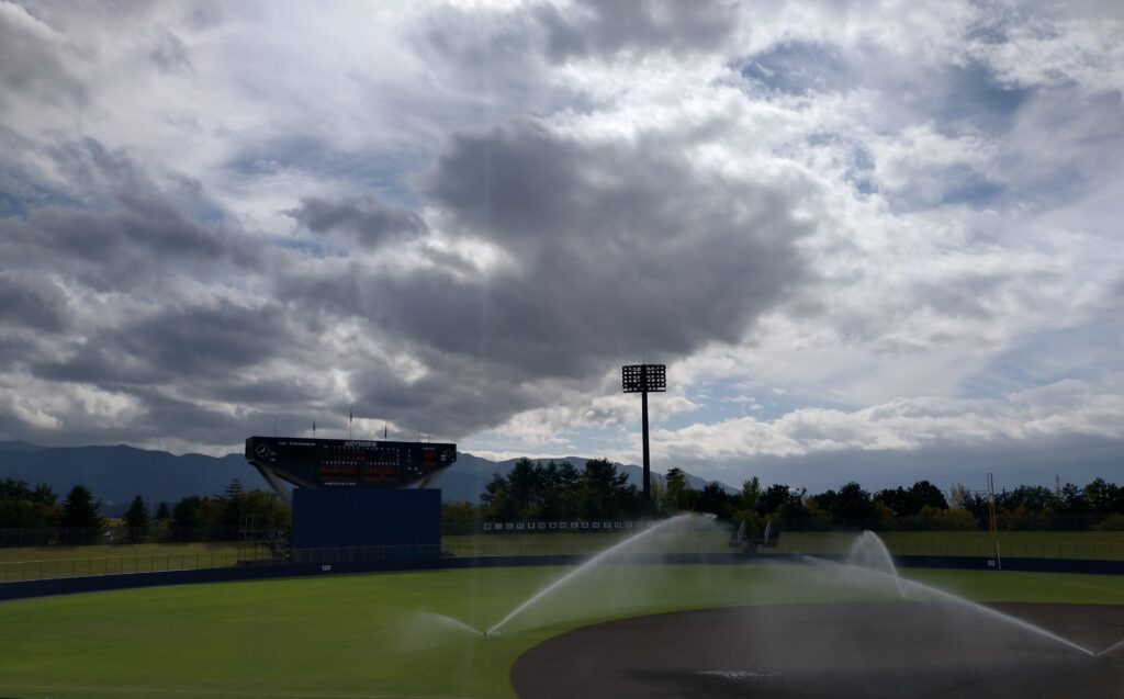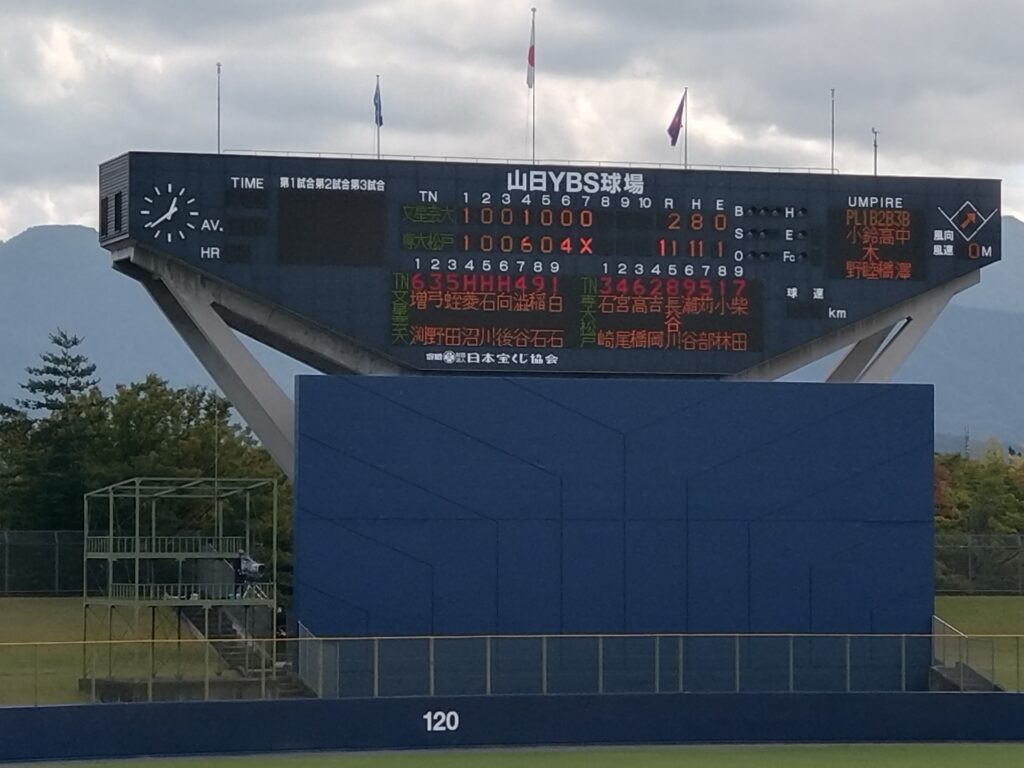 会場は甲府市の小瀬(こせ、と読みます)スポーツ公園野球場、ネーミングライツでは山日YBS球場となっています。